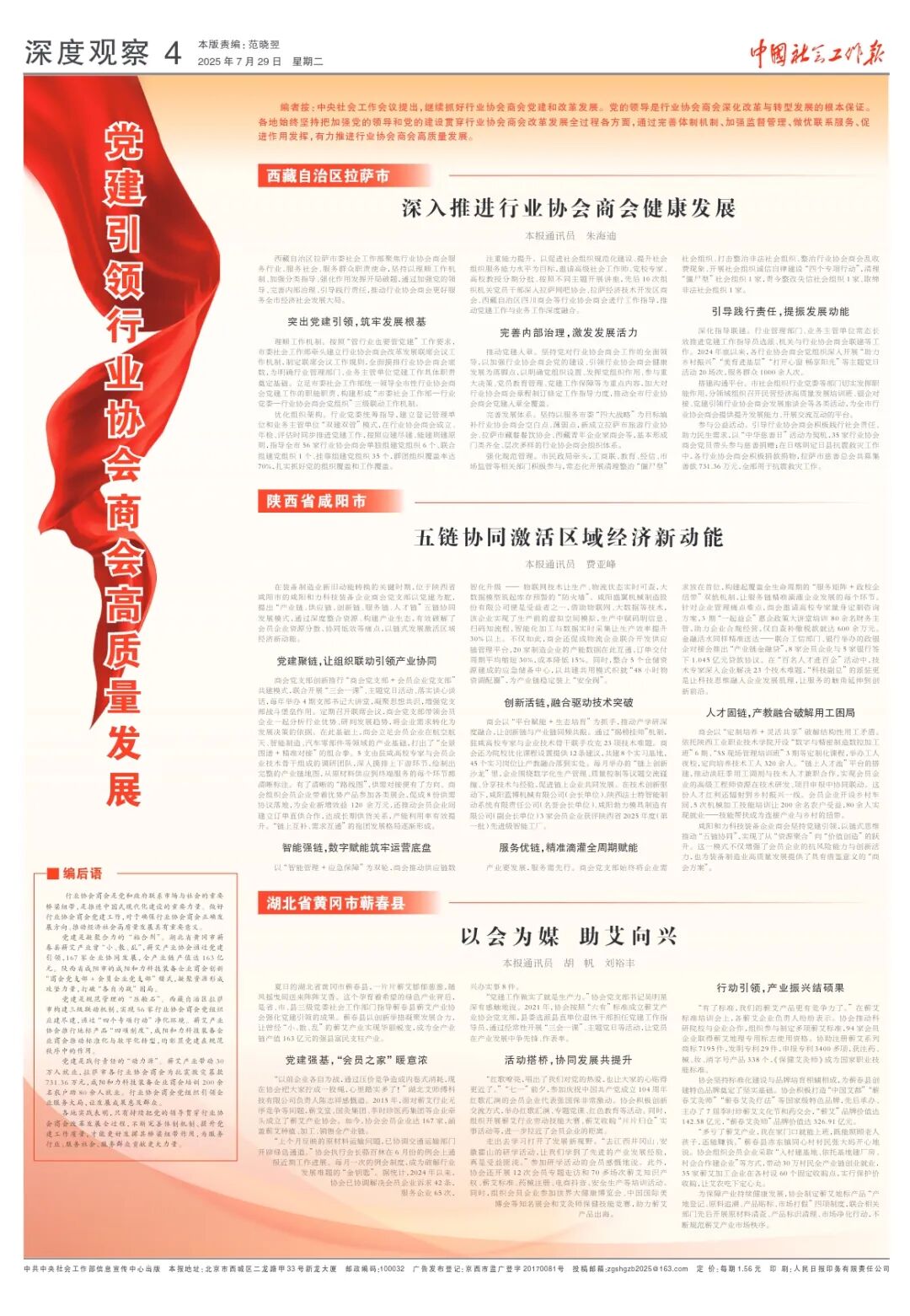 各地实践表明,只有持续把党的领导贯穿行业协会商会改革发展全过程,不断完善体制机制、提升党建工作质量,才能更好发挥其桥梁纽带作用,为服务行业、服务社会、服务群众贡献更大力量。